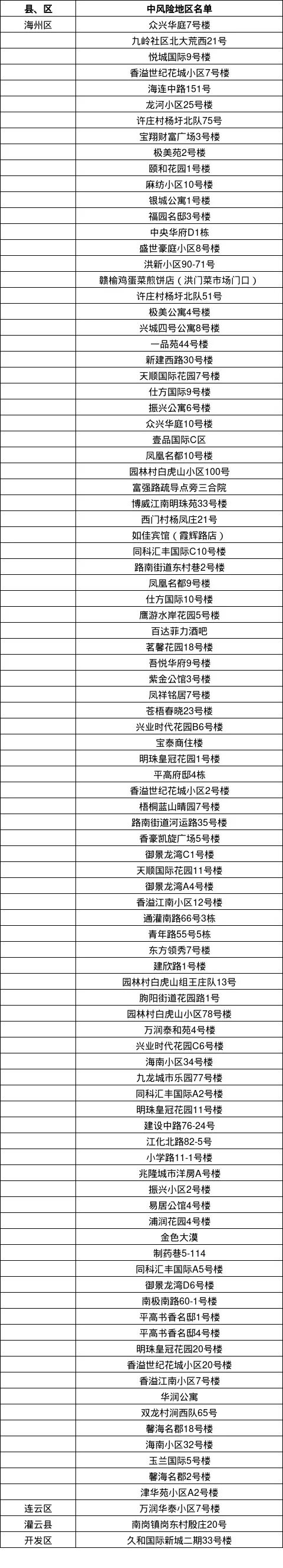 海州區(qū)潤(rùn)琦苑3號(hào)樓、天景美地4號(hào)樓、溫僑綠苑B2由中風(fēng)險(xiǎn)地區(qū)調(diào)整為低風(fēng)險(xiǎn)地區(qū)。