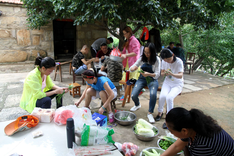 這處清幽潔凈的農(nóng)家小院成了隊(duì)員大展廚藝的用武之地,大家迅速整理好自帶的蔬菜食物,按各自特長(zhǎng)分好工。有清理蔬菜的、有和面的、有刷鍋燒水的,那些實(shí)在幫不上忙的便湊到一起圍坐在院中的樹蔭下開始“摜蛋”比賽。廚房中,面對(duì)農(nóng)戶家中的那兩口大草鍋,負(fù)責(zé)炒菜的隊(duì)員直撓頭,因?yàn)樵诔抢飳?shí)在是無處尋覓這樣的鍋灶了,更不知該如何才能把這灶火燒得旺旺的。這時(shí)我們的女隊(duì)員劉惠自告奮勇,勇敢地?fù)?dān)起了“伙頭軍”的重任。還別說,在經(jīng)過戶主老大爺?shù)囊环更c(diǎn)后,一會(huì)兒功夫這灶火便被她燒得有規(guī)有距起來。很快,灶房便飄出了炒肉、煎蛋的香味。此時(shí),院中也已擺起了包旱餃的陣式來了。面已和好,兩種口味的餡料也已備好。有負(fù)責(zé)搟餃子皮的,有負(fù)責(zé)包餃子的,隊(duì)員們賽速度、賽質(zhì)量,兩種口味的餃子被分別擺放在各自的簸箕里。看著形態(tài)各異的餃子,大家忍不住評(píng)價(jià)起來,最終有隊(duì)員被冠上了“專業(yè)面點(diǎn)師”的雅號(hào)。人多力量大,當(dāng)所有的菜肴、面點(diǎn)擺到長(zhǎng)桌上時(shí),大家開心不已,雖然這算不上美味佳肴,但自己的勞動(dòng)果實(shí)卻總是最美味。