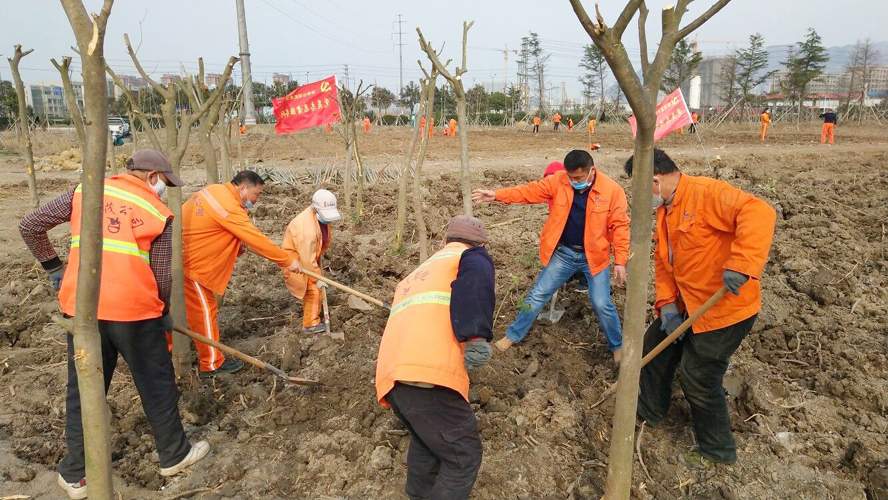 為保證植樹質(zhì)量,該公司配備多名專業(yè)技術(shù)人員進(jìn)行全程技術(shù)指導(dǎo)。上午8時許,在移苗現(xiàn)場,一臺挖掘機(jī)轟隆隆地作業(yè)著,小心翼翼的將一棵棵大樹苗連根拔起,在保證不擠壓的情況下,輕抬輕放,裝苗運(yùn)輸。在栽苗活動現(xiàn)場,全體工作人員戴好頭罩、手套等防護(hù)用具,在統(tǒng)一指揮下,彼此間隔1米左右,擼起袖子、揮著鐵鍬、扛著鋤頭飛快地投入到栽苗植樹作業(yè)中。大家分工協(xié)作,有的開槽挖坑;有的栽植樹苗;有的抬木扶苗;有的回填新土;有的纏繩護(hù)樹;有的澆水保濕……到處都是忙碌的身影,整個植樹活動現(xiàn)場一片熱火朝天的繁忙景象。放眼望去,在明媚的春光中,一排排新栽下的樹苗迎風(fēng)挺立,生機(jī)勃勃,組成了一道道靚麗的風(fēng)景線。
