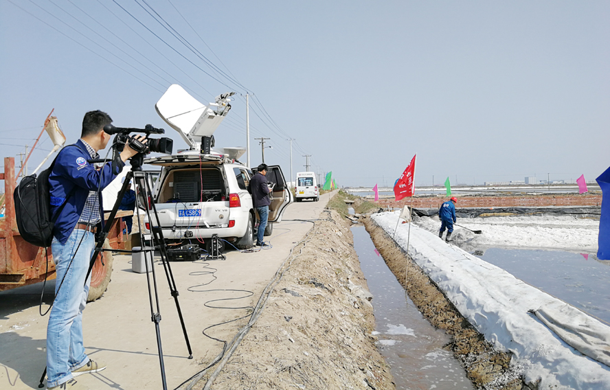 攝制組動用直播車、航拍、信號傳輸+高清攝像機等設備,工作人員各有分工,同步拍攝鹽田生產(chǎn)、鹽工勞動以及食鹽生產(chǎn)等淮鹽收獲的喜人畫面,記者更是在鏡頭的一路跟拍下,一邊自己動手操作,一邊與現(xiàn)場勞動的鹽工親切交談,向觀眾詳細解讀生態(tài)淮鹽灘曬生產(chǎn)和食鹽生產(chǎn)的工藝流程,為大家熟悉、了解和保護淮鹽提供一次直觀的認知機會。