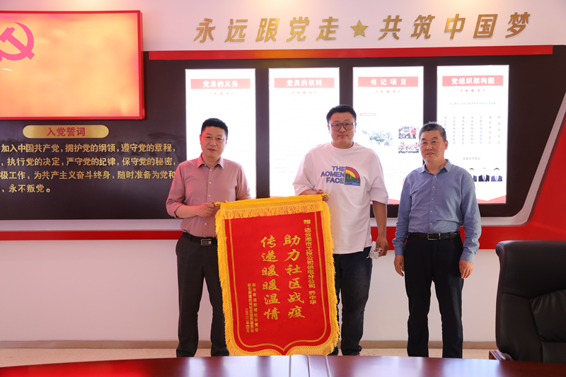 5月5日下午,新東街道新城社區(qū)居委會工作人員來到公司,為感謝公司黨員喬中華在該社區(qū)疫情防控期間守護居民群眾的健康安全,為打贏疫情防控阻擊戰(zhàn)發(fā)揮的積極作用,將寫有“助力社區(qū)戰(zhàn)疫 傳遞暖暖溫情”的錦旗送到公司黨委書記、總經(jīng)理宋晟曄手中。