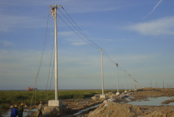 連云新城三期供電線(xiàn)路緊貼海堤邊。受海堤建設(shè)進(jìn)度和海風(fēng)海潮的影響,低矮的壩堤經(jīng)常被風(fēng)刮起的海浪浸頂,石塊突起,洼水漣漪,淤泥纏足,堤邊路面凹凸不平,道路僅限一輛車(chē)通行,擁擠不堪,工程施工難度極大。為提升速度,加快進(jìn)度,臺(tái)北供電所克服困難,緊鑼密鼓地展開(kāi)工作,以期早日完工?,F(xiàn)場(chǎng)勘察地形地貌,了解潮汐運(yùn)動(dòng)規(guī)律,制定施工計(jì)劃,設(shè)計(jì)措施方案,組織人力,采購(gòu)材料,投入施工。施工人員采用彈性工作時(shí)間,利用落潮時(shí)機(jī),搶運(yùn)電桿,及時(shí)立桿和裝配。職工們發(fā)揚(yáng)不怕苦,不畏難的精神,不懼海風(fēng)吹臉、海水浸衣,爬上距離海平面二十多米仿佛搖擺不定的高桿,懸在空中一絲不茍地操作,保障了工程的全面竣工。