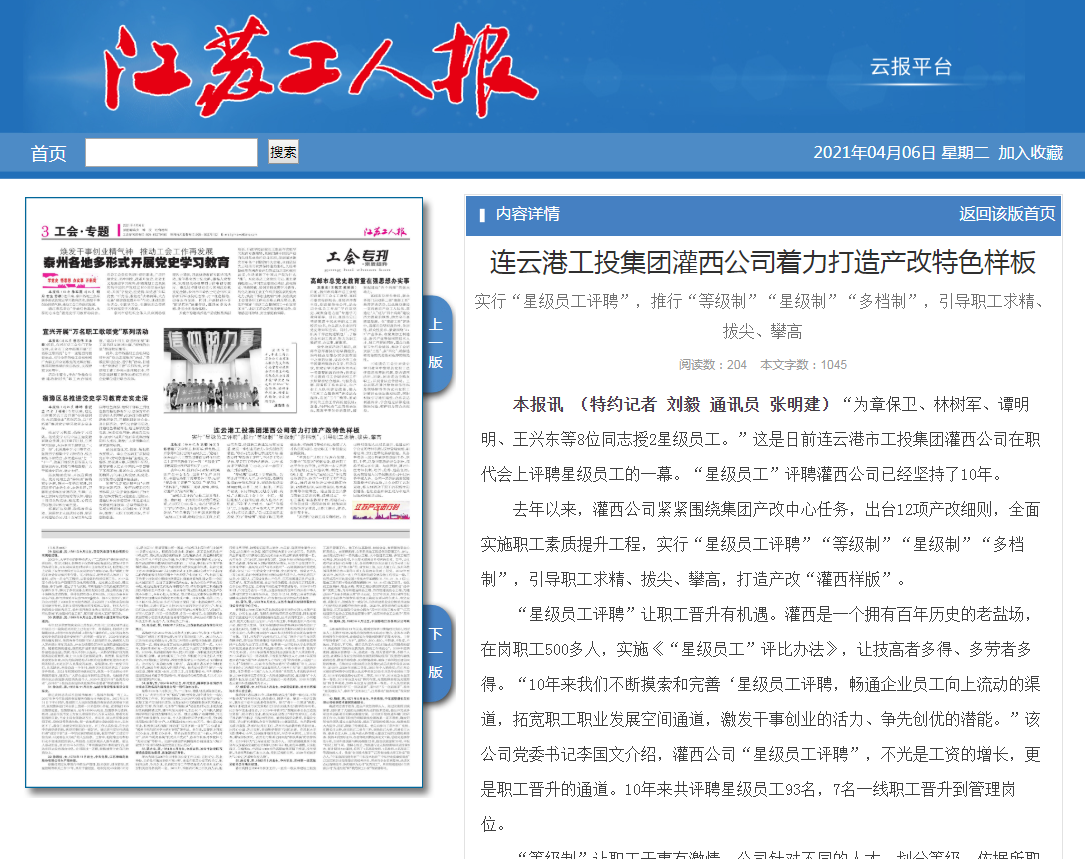 “星級員工評聘”讓職工晉升有機遇。灌西是一個擁有百年歷史的老鹽場,在崗職工500多人,實施《“星級員工”評比辦法》,讓技高者多得、多勞者多得?!?0年來我們不斷摸索和完善‘星級員工評聘,暢通企業(yè)員工向上流動的渠道,拓寬職工職業(yè)發(fā)展空間通道,激發(fā)干事創(chuàng)業(yè)的活力、爭先創(chuàng)優(yōu)的潛能?!痹摴军h委書記李國文介紹,灌西公司“星級員工評聘”,不光是工資的增長,更是職工晉升的通道。10年來共評聘星級員工93名,7名一線職工晉升到管理崗位。
