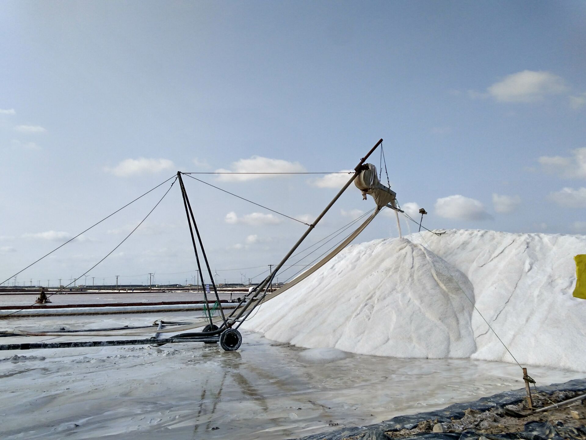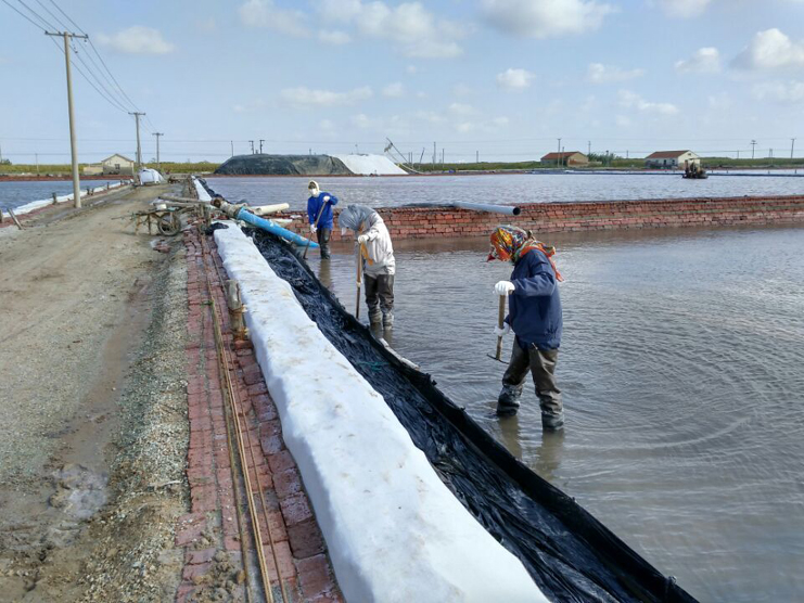 10月6日,在日曬制鹽新河分公司十班,幾名鹽工在不遠(yuǎn)處鹽池內(nèi)整理扒過鹽的格塊,一臺(tái)唐三零機(jī)械正在最后一塊鹽池內(nèi)緩緩移動(dòng)集鹽,鹽泵運(yùn)轉(zhuǎn)不停,輸送鹽上廩,一條鹽廩即將筑成。在國(guó)慶假日期間,日曬制鹽公司值班人員不脫崗、生產(chǎn)經(jīng)營(yíng)不斷線、鹽業(yè)生產(chǎn)不停歇,入秋以來(lái),已扒鹽5萬(wàn)噸,為公司的國(guó)慶假日增添了道道靚麗的風(fēng)景。