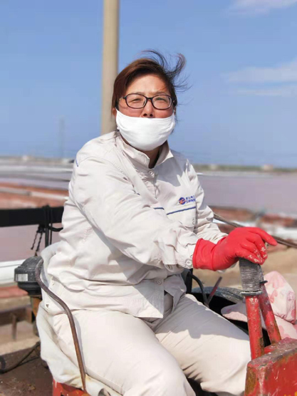 每一個女孩都喜歡美麗的衣服,都喜歡把自己裝扮得漂亮迷人??墒枪ぷ鞯奶厥庑圆辉试S鹽灘工“貌美如花”。周娟,37歲,新河制鹽分公司5班一名普通的女工,她關注班組集體事務,能夠團結、關心班組女工,并積極帶領女職工昂揚向上,奮發(fā)有為,為單位鹽業(yè)生產(chǎn)多作貢獻。周娟特別注重對新上崗的員工培訓教育工作,她總是不厭其煩講解原鹽操作流程及工作中的注意事項和安全隱患,毫不保留將自己多年的經(jīng)驗傳授給大家。炎熱的夏天,當大家坐在辦公室,吹著空調、喝著冰水時,她和她的同事依舊在鹽灘忙碌著,嬌嫩的皮膚被曬得黝黑。盡管如此,她依然每天駕駛著活茬機,一遍又一遍地游走在鹽田,將汗水撒在工投。