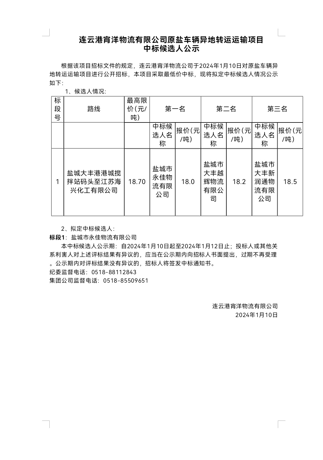 連云港宵洋物流有限公司原鹽車輛異地轉運運輸項目中標候選人公示