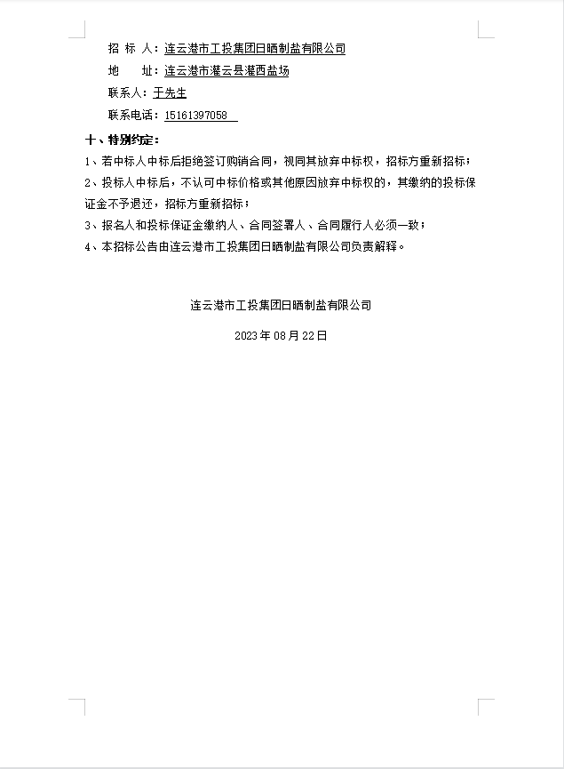 連云港市工投集團(tuán)日曬制鹽有限公司PE管采購(gòu)公告