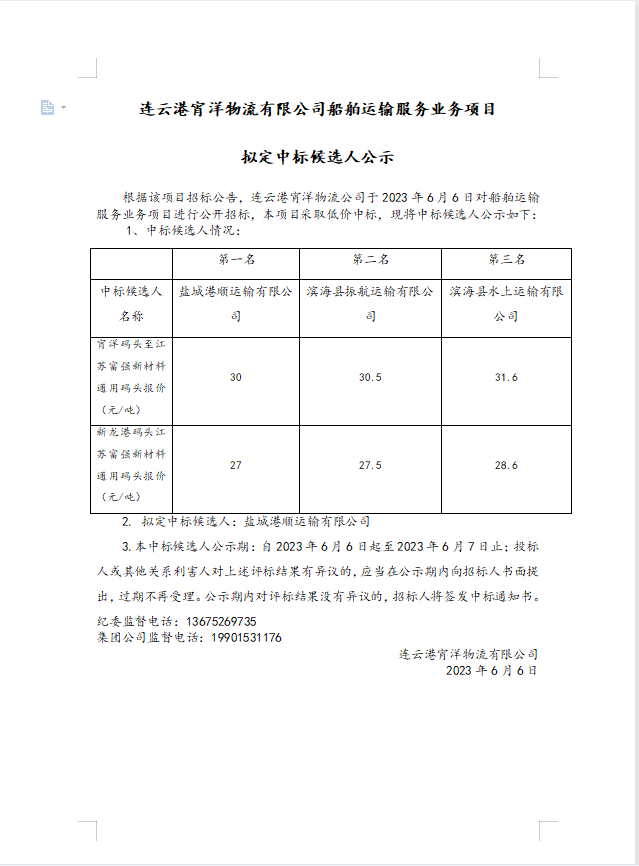 連云港宵洋物流有限公司船舶運(yùn)輸服務(wù)業(yè)務(wù)項(xiàng)目擬定中標(biāo)候選人公示