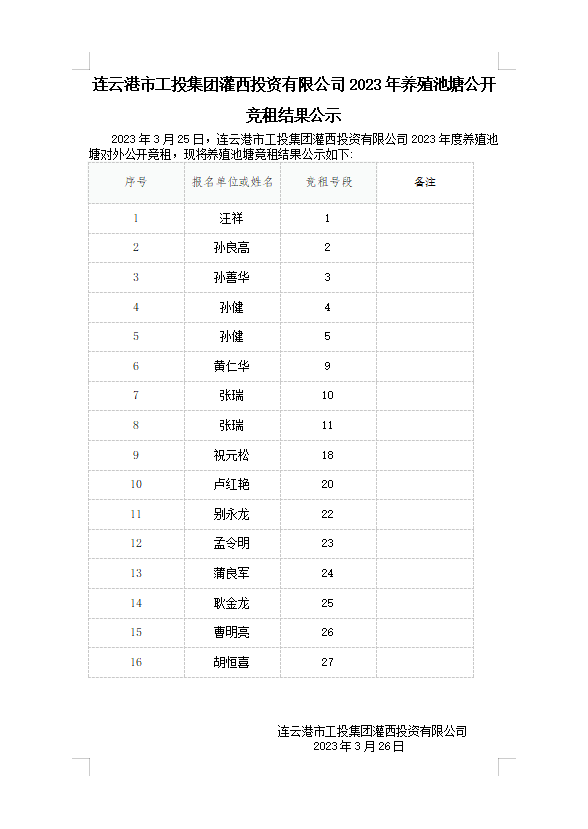 連云港市工投集團灌西投資有限公司2023年養(yǎng)殖池塘公開競租結(jié)果公示