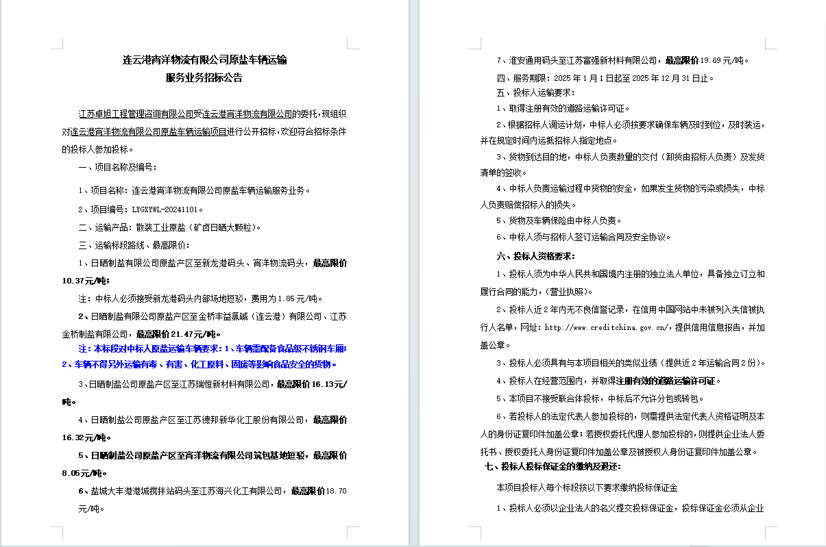 連云港宵洋物流有限公司原鹽車輛運(yùn)輸服務(wù)業(yè)務(wù)招標(biāo)公告