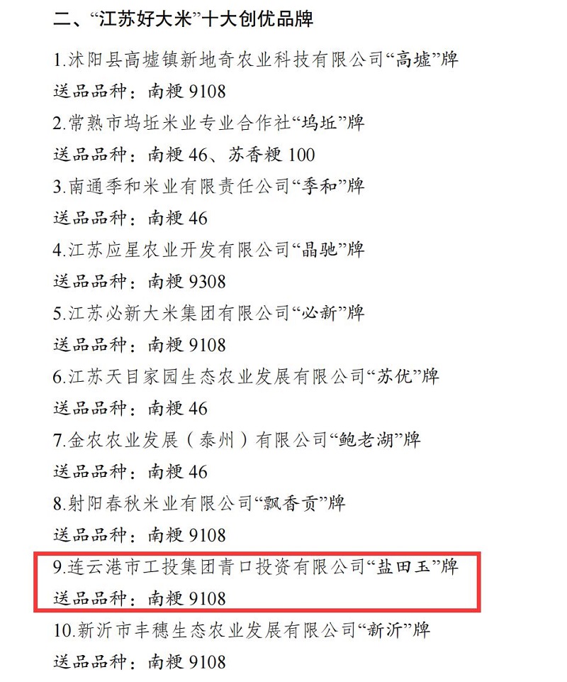 近日,第八屆江蘇好大米評鑒推介結(jié)果公布,“鹽田玉”品牌再創(chuàng)佳績,榮獲“江蘇好大米”十大創(chuàng)優(yōu)品牌。