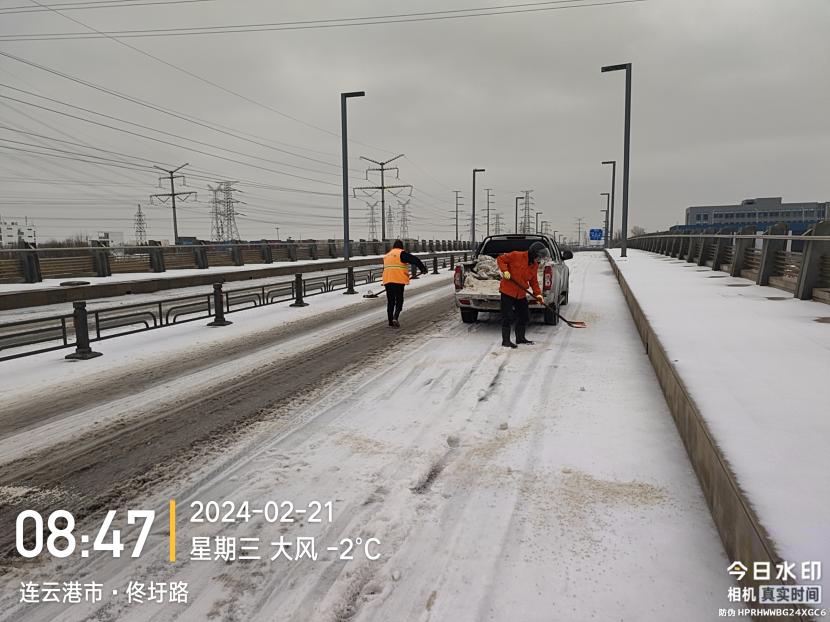 ? ? 本次除雪采取隨降隨清、連續(xù)作業(yè)的方式,及時(shí)、快速清理路面積雪,同時(shí)根據(jù)積雪厚度,采取撒融雪劑、鏟雪車推雪以及人工配合等多種除雪方式進(jìn)行緊急除雪除冰作業(yè)。