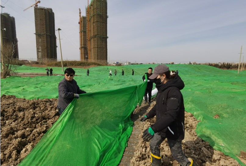 寒冷絲毫沒有降低大家的熱情,路面因為每天噴灑防塵導(dǎo)致潮濕泥濘,大家穿上雨靴,爬上爬下,一鼓作氣,經(jīng)過兩天齊心協(xié)力的辛勤勞作,防塵網(wǎng)終于覆蓋完畢。遠遠望去,覆蓋綠網(wǎng)后的區(qū)域如同覆蓋了一片綠色植被。此次綠網(wǎng)覆蓋行動,不僅抑制了二次揚塵污染環(huán)境,保護了生態(tài)環(huán)境,同時達到了環(huán)境美化的效果。