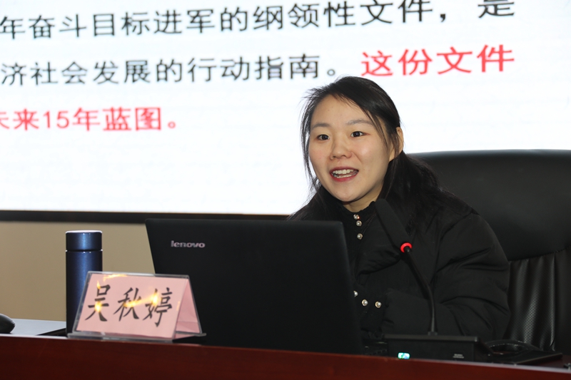 吳秋婷副主任在題為“開啟全面建設(shè)社會主義現(xiàn)代化國家新征程”報告中,從新階段與新目標(biāo)、新理念與新部署、新變化與新格局等三個方面給大家解讀了黨的十九屆五中全會精神?!靶码A段與新目標(biāo)”部分,介紹了我國在決勝全面建成小康社會取得的三大決定性成就,即十三五期間,全面深化改革取得重大突破;經(jīng)濟實力、科技實力、綜合國力躍上新的大臺階。在“新理念與新部署”部分,從社會發(fā)展、創(chuàng)新發(fā)展、統(tǒng)籌發(fā)展等角度分別提出了習(xí)近平總書記在新時代下對中國共產(chǎn)黨人的要求以及我國社會發(fā)展必須遵循的基本原則。在“新變化與新格局“部分,強調(diào)實現(xiàn)“十四五”規(guī)劃和2035年遠景目標(biāo)意義重大、任務(wù)艱巨,但是前景光明,全黨全國各族人民要緊密團結(jié)在以習(xí)近平同志為核心的黨中央周圍,同心同德,頑強奮斗,積極響應(yīng)十九屆五中全會對全黨全國人民的號召,奪取全面建設(shè)社會主義現(xiàn)代化國家的勝利。