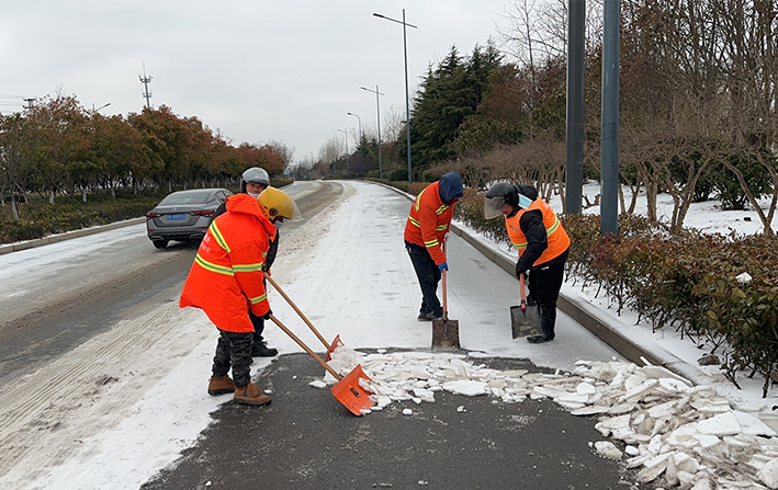 雪花紛飛,寒風(fēng)凜冽,板橋工業(yè)園區(qū)內(nèi),除雪車、雪輥車等機(jī)械設(shè)備齊上陣,采取機(jī)械化與人工除雪相結(jié)合的方式,雪鍬、掃帚齊上陣,大家你鏟我除、干勁十足,以最快的速度清除板橋園區(qū)云港路、祥和路、瑞和路等交叉路口、重要地段冰凍積雪。