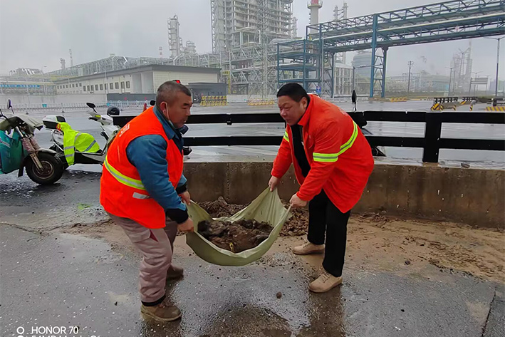 12月13日夜里,受北方冷空氣影響,徐圩地區(qū)普降中雨。為保障石化園區(qū)冬季道路周邊環(huán)境整潔靚麗,園區(qū)近10余名黨員先鋒無懼風(fēng)雨,樂于奉獻(xiàn)堅守道路最前沿,風(fēng)雨中彰顯黨員敬業(yè)高尚風(fēng)采。