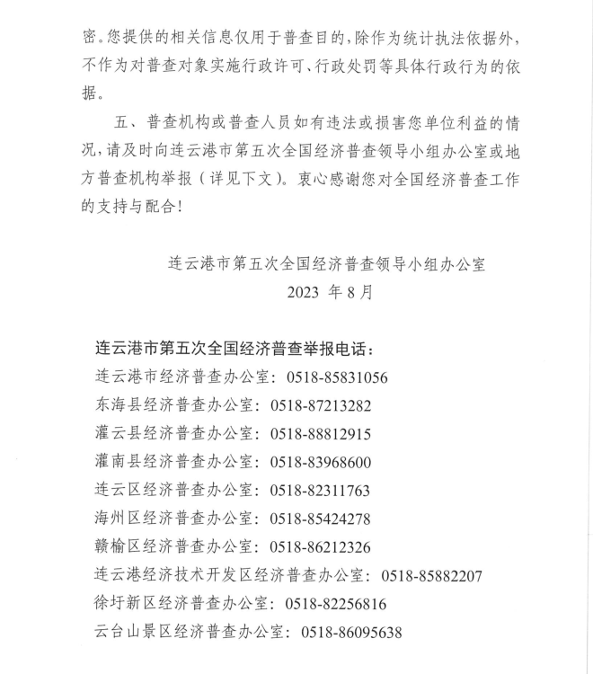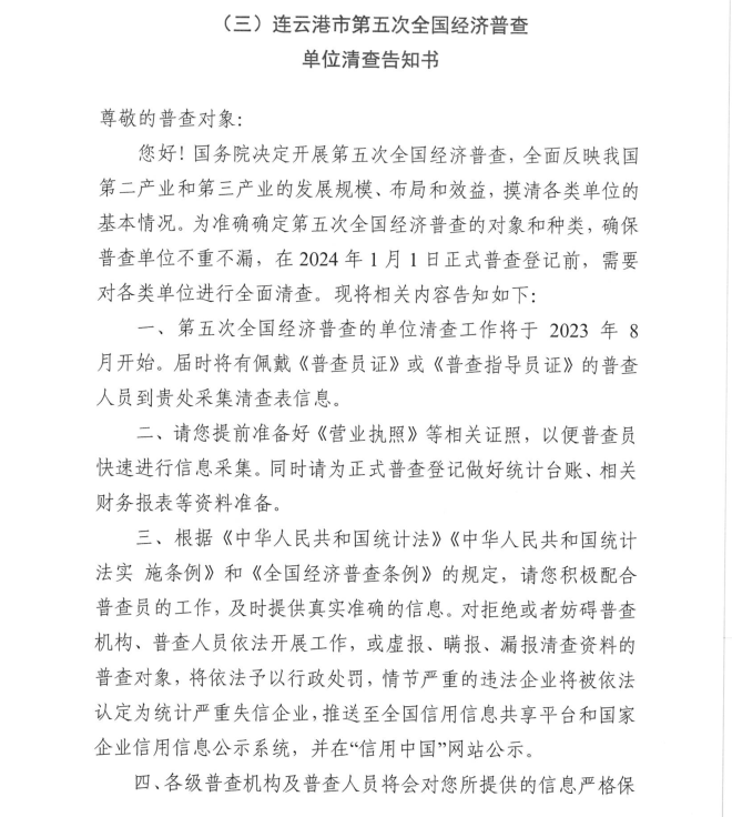 按照《全國經(jīng)濟普查條例》規(guī)定,國務院決定于2023年開展第五次全國經(jīng)濟普查,為提高經(jīng)濟普查質量,進一步推進普查工作順利開展,公司按照上級第五次全國經(jīng)濟普查宣傳動員工作要求,現(xiàn)將《連云港市第五次全國經(jīng)濟普查單位告知書》公示如下: